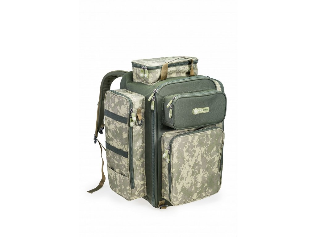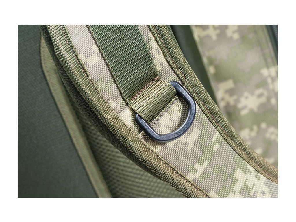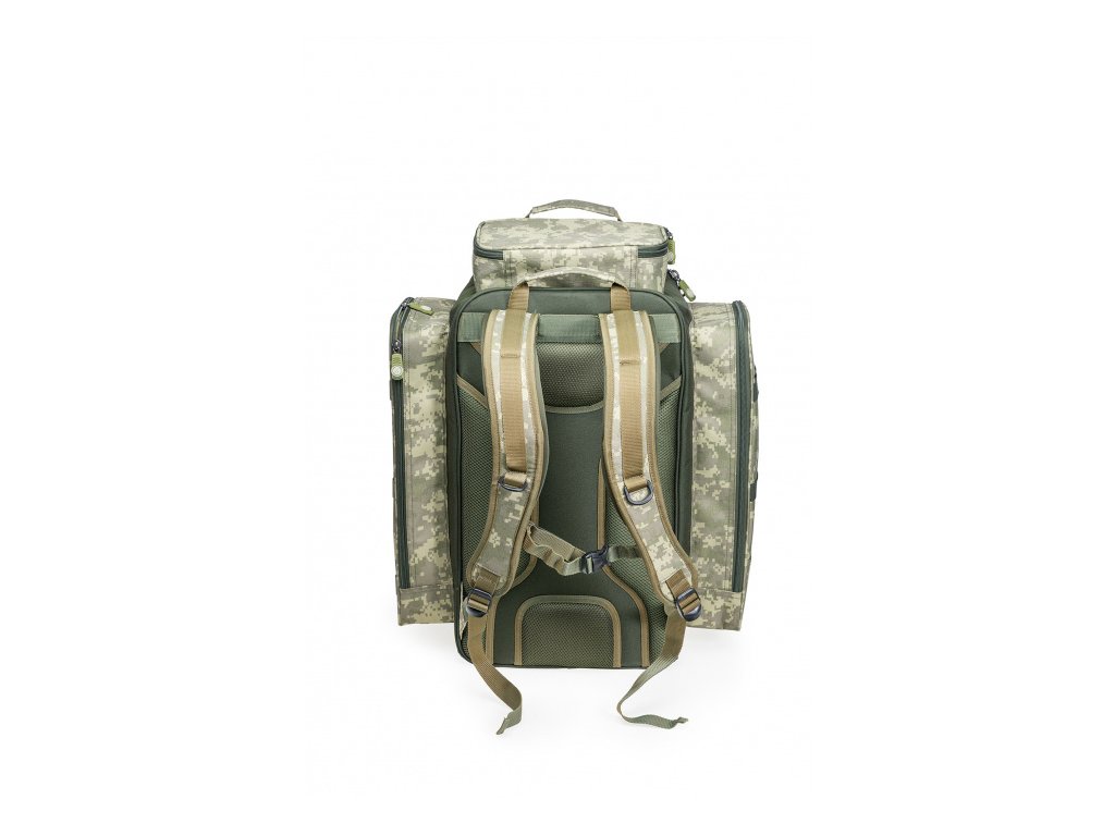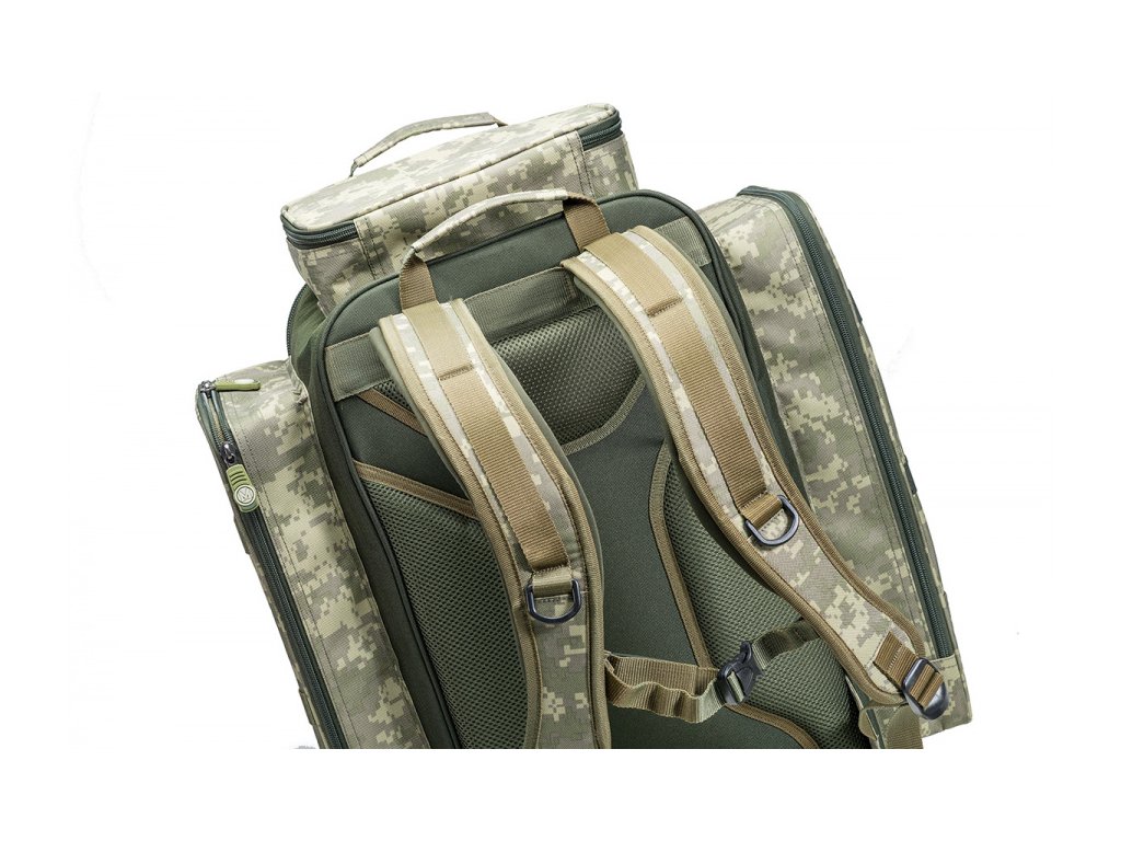 Hlavní komora je snadno přístupná díky kompletně otevíratelné přední stěně. Pět velmi prostorných vnějších kapes umožňuje přehledné uložení systémových boxů a celé řady drobného příslušenství. Polstrované popruhy i anatomicky tvarovaná a odvětraná zádová část umožňují pohodlné nošení naplněného batohu i na delší vzdálenosti. Odolný, nepromokavý a snadno omyvatelný materiál B-POL600D v CamoCODE včetně originálních táhel zipů podtrhují prémiovou kvalitu tohoto batohu.