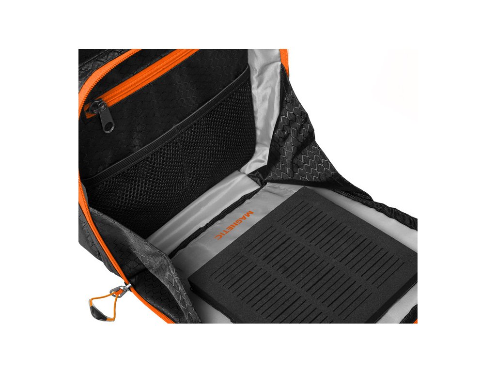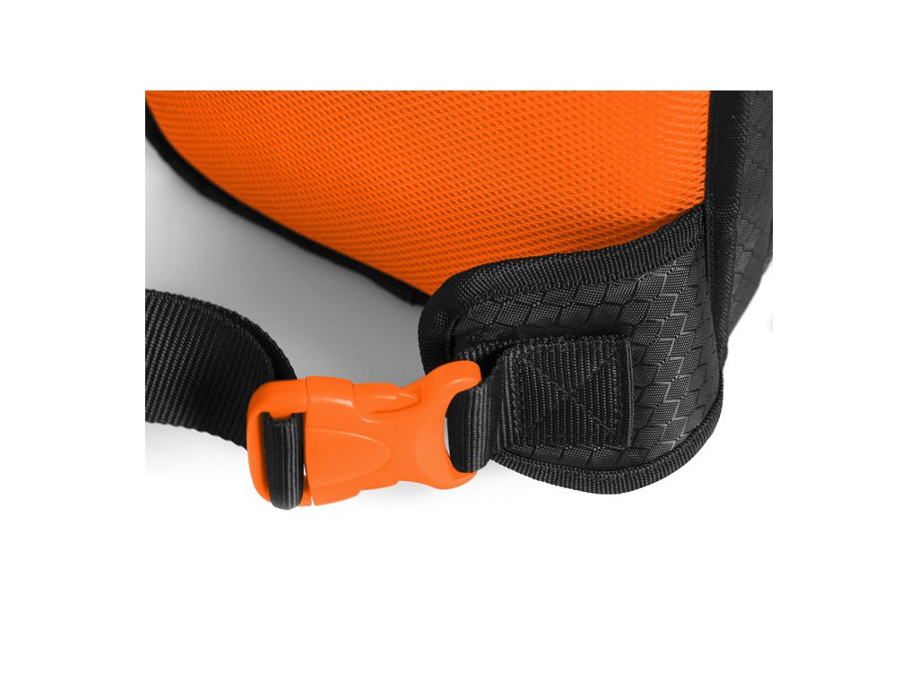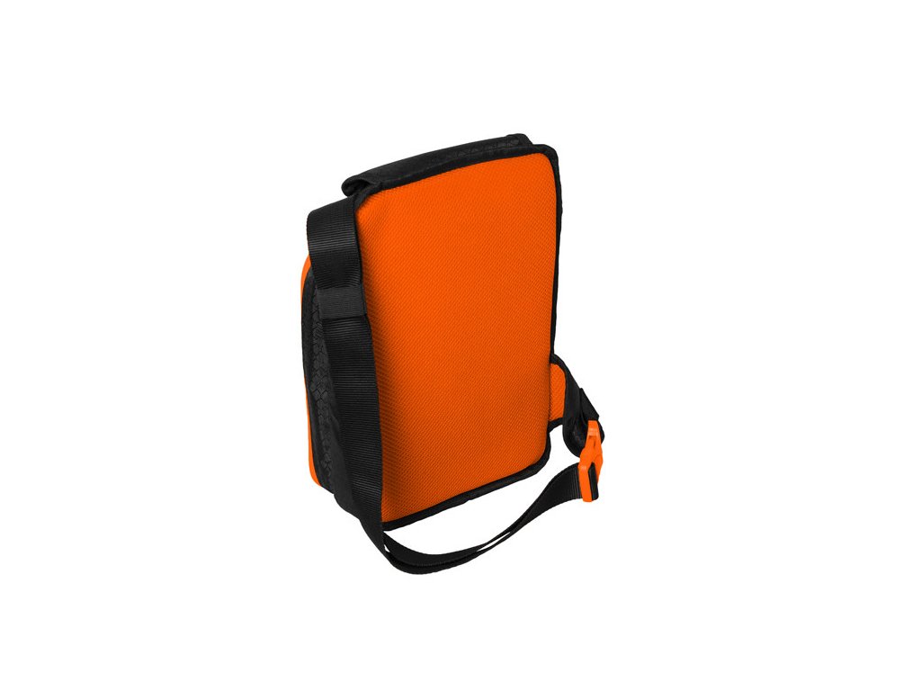 Na zadní straně se nachází polstrování oranžové barvy, které barevně doplňují i ??zipy v téže barvě. Ramenní popruh je černé barvy a je osazen oranžovým plastovým klipem.