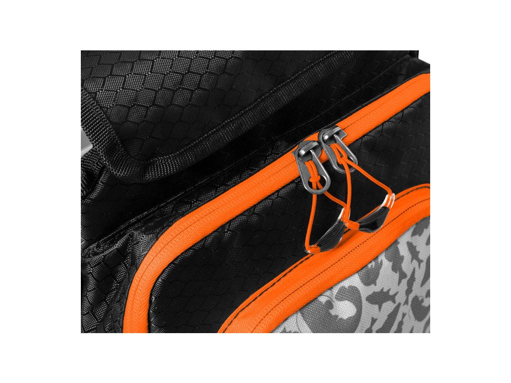 Crossbody je vybavena kvalitními zipy oranžové barvy. Zipy jsou vybaveny plastovými taháčky na oranžovém popruhu, který je na konci rozšířený, a proto je možné ho rychle uchopit. Doplňky oranžové barvy umožňují rybáři, aby byla taška dobře viditelná i za šera a věděl ji okamžitě najít. Crossbody je ušitá z lehké, ale přitom odolné látky černé barvy.