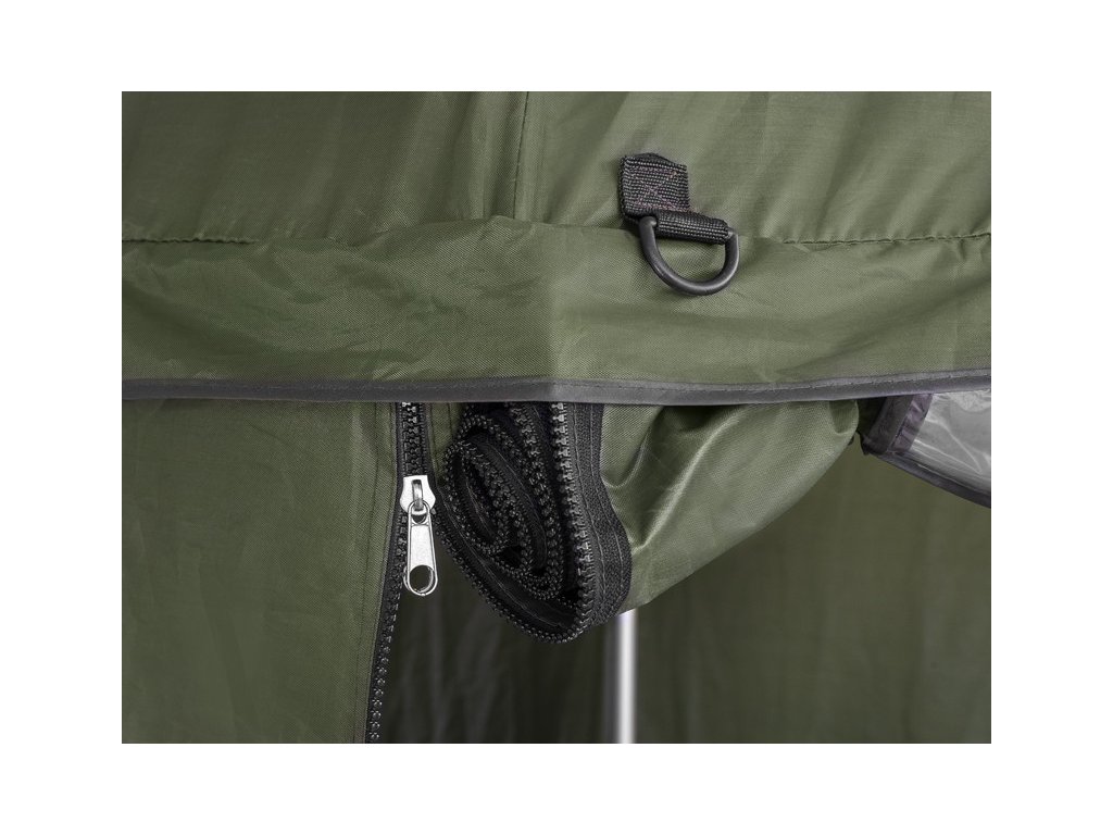Díky boční prodloužené stěně po celém obvodu budete před nepříznivými podmínkami chráněni ze všech stran. Bočnice disponuje dveřmi, které jsou opatřeny kvalitními zipy. Kromě toho se na dveřích nachází průhledné plastové okno, díky kterému budete z deštníku vidět na pruty i za deště.