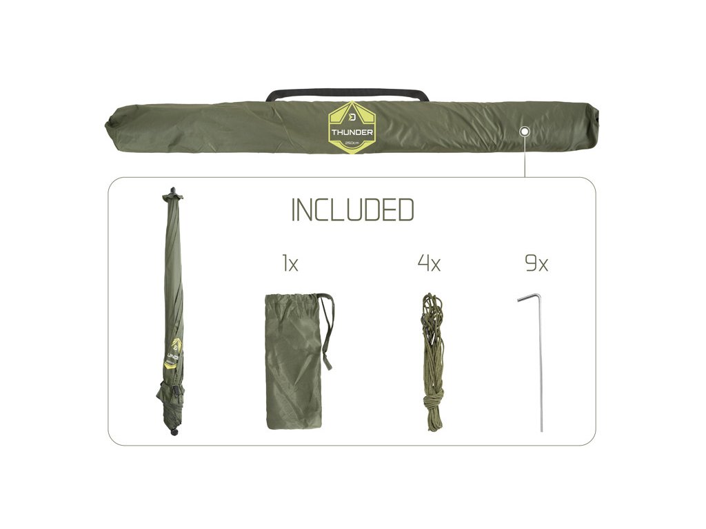 Deštník s kompletně uzavíratelnou bočnicí Delphin THUNDER FullWALL je ideální volbou do nepříznivého počasí během kratších výprav. Perfektně ochrání před nepříjemným sluncem, ranní rosou, ale i vyšším úhrnem srážek. Pro lepší stabilitu ve větru je opatřen čtyřmi ukotvovacími lany. Švy deštníku jsou důkladně podlepeny voděodolnou páskou pro zajištění 100% nepromokavosti i v případě silného deště.