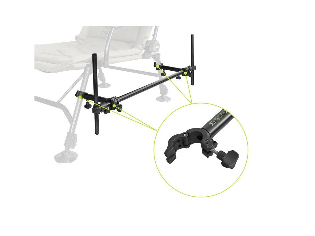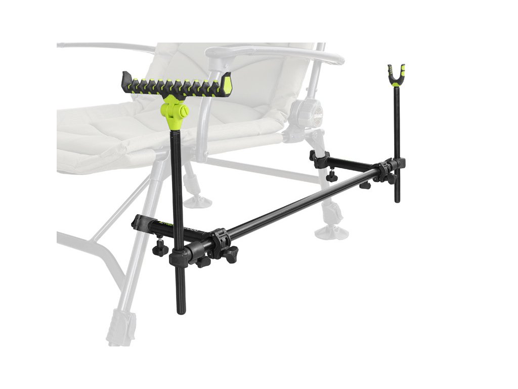 Na obou koncích produktu se nacházejí tyčky umístěné v plastových klipech, které lze posouvat ve vertikální rovině, případně otáčet. Na horním konci tyček se nachází univerzální závit určený pro různé druhy feederových držáků na pruty. Držák je na obou koncích teleskopický, takže jej lze vysunout podle vašich potřeb do každé strany.