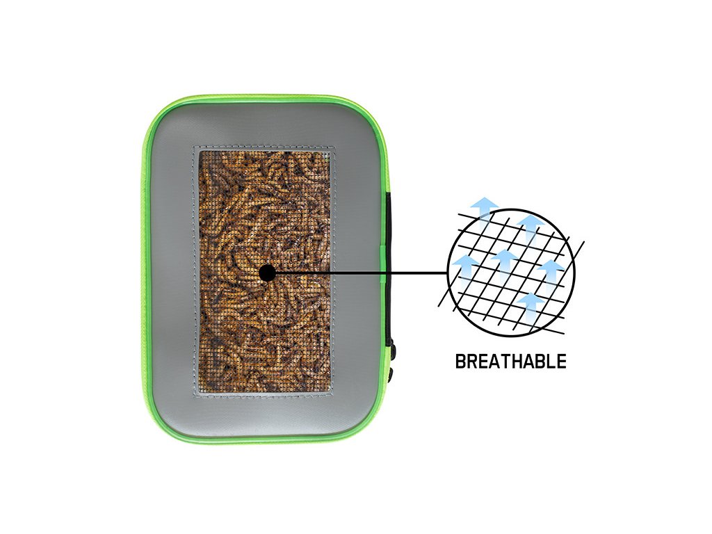 Taštička je černé barvy s šedým víkem, výrazným - dobře viditelným zipem, který ji dokonale uzavře a tím zamezí nechtěnému úniku červů.