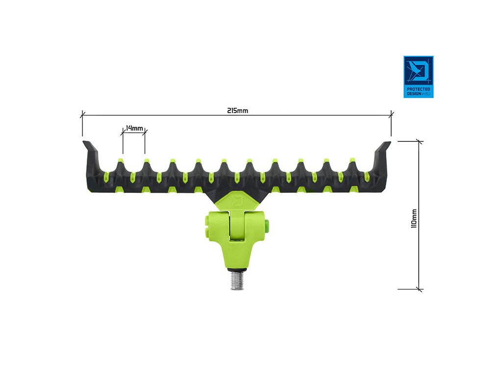 Držák je vyroben z odolných materiálů, takže se snadno nepoškodí a nepoškrábe. Jeho speciálně navržený tvar poskytuje dokonalou podporu prutu a zabrání jeho vysmeknutí i při razantních záběrech. Povrch držáku je potažen pogumovaným materiálem, který je extra šetrný k povrchu prutu a chrání jej před poškozením. Univerzální závit umožňuje uchycení na všechna standardní ramena, stojany a vidličky.