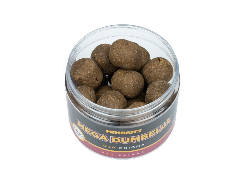 Mega Dumbells v neobvyklém rozměru 24x30mm jsou velkou selektivní nástrahou, která na jedné straně limituje záběry od nechtěných ryb, a naopak je lákavá pro velké trofejní kusy kaprů. Gangster G20 Enigma těží nejen z jedinečné směsi s 60% rybích mouček a 9% exraktů, ale také podobně jako fenomenální G2 ze špičkových tekutých potrav, esencí a esenciálních olejů včetně úžasného ančovičkového extraktu. Jejich kombinace je natolik složitá, že tato příchuť dostala název Enigma podle slavného šifrovacího stroje.