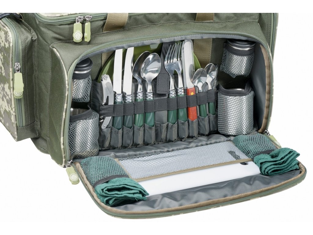 Taška obsahuje dva odolné talíře, kompletní příbory, dózy na cukr a sůl s precizním silikonovým těsněním, krájecí prkénko, vroubkovaný nůž, dva termohrnky, otvírák na pivo a víno a dva menší froté ručníky. To vše atraktivním designu série CamoCODE.