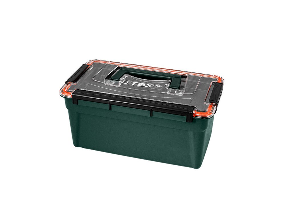 Celý kufřík je pevně fixován podélnými klipy v počtu 3ks, které zaručí bezpečnou přepravu nástrah nebo ostatního rybářského příslušenství. Je dodáván v tmavozelené barvě s transparentním víkem, které je vybaveno červenou těsnící gumou po celém jeho obvodu.