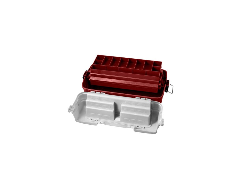 Balení obsahuje také plastové příčky, aby si každý rybář mohl tyto přihrádky přizpůsobit podle vlastních představ. Uzavírá se dvěma plastovými klipy s kovovými sponami, které pevně drží dva vrchní výklopné díly. Je dodáván v kombinaci barev stříbrná a bordó.
