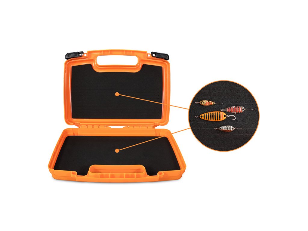 Stačí jednoduše jigový háček zatlačit do zářezu, nástraha zůstane nepoškozená a pěna ochrání hrot háčku proti zatupení. Také je možné krabici použít jako odkládací prostor pro TWISTO systémy bez nechtěného motání. Velmi jednoduše lze v krabici uložit i samostatné háčky, díky čemuž budete mít vše potřebné připravené k lovu. Vyrobena je z oranžového neprůhledného plastu, který redukuje možnost koroze v případě uložení již použitých komponentů.