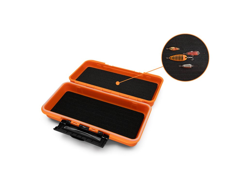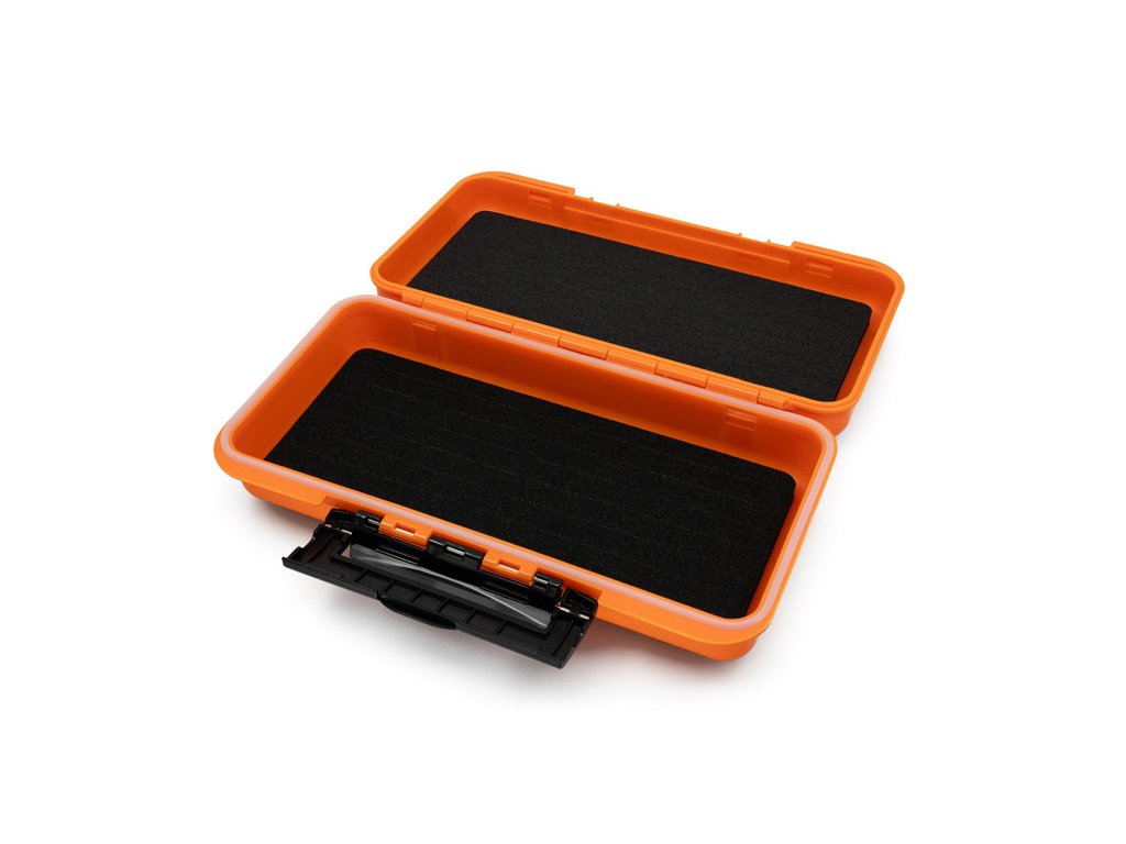 Stačí jednoduše jigový háček zatlačit do zářezu, nástraha zůstane nepoškozená a pěna ochrání hrot háčku proti otupení. Také je možné krabici použít jako odkládací prostor pro TWISTO systémy bez nechtěného motání. Velmi jednoduše lze v krabici uložit i samostatné háčky, díky čemuž budete mít vše potřebné připravené k lovu. Vyrobena je z oranžového neprůhledného plastu, který redukuje možnost koroze v případě uložení již použitých komponentů. Vybavena je praktickými externími klipy z plastu a těsněním proti vlhkosti.