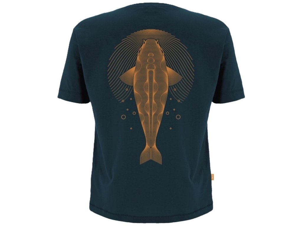 Design tohoto trička zobrazuje kapra, který prostupuje vodní hladinou. Grafika Ripples využívá styl klíčové čáry ilustrace reprezentující pohyb vody. Jednobarevný sítotisk na tmavě modré tkanina 140 g/m2 s tkanými detaily na bočním poutku.