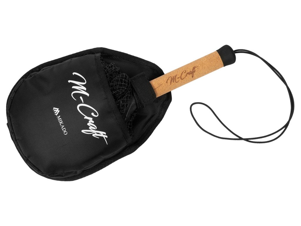 Kompaktní podběrák raketového tvaru, který je zakončen elastickou gumou s karabinou.