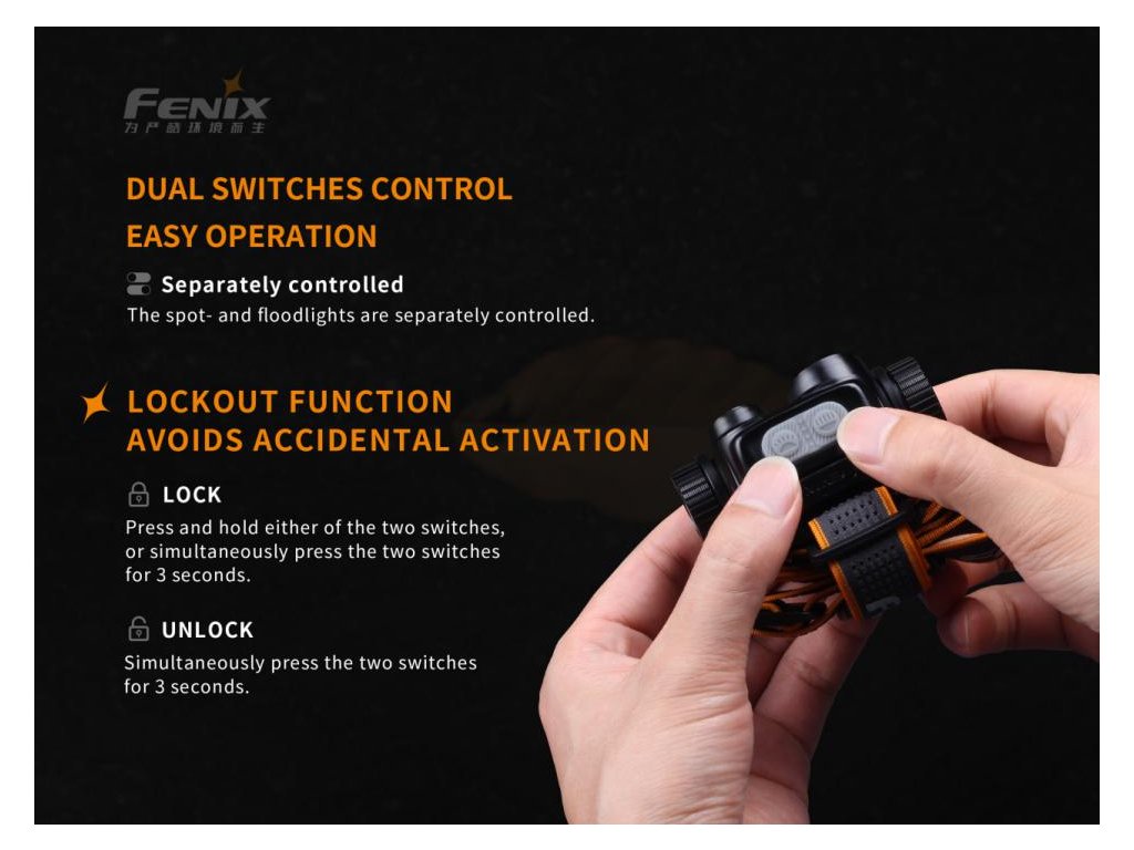 Ovládací tlačítka lze uzamknout, aby nedošlo k samovolnému zapnutí např. při převozu v zavazadle - ve vypnutém stavu stiskněte obě tlačítka a držte je min 3 vteřiny, poté čelovka zabliká, čímž indikuje uzamknutí. Pro odemknutí je třeba opět obě tlačítka podržet po dobu tří vteřin.