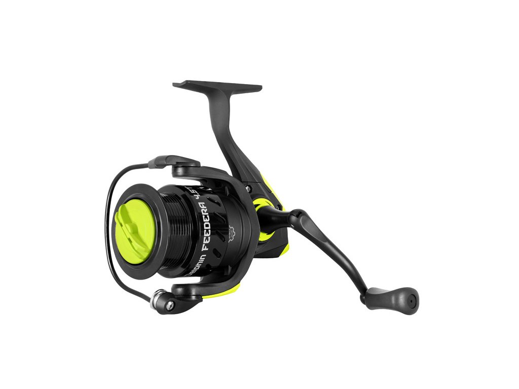 Naviják je vybaven sedmi (6+1) kuličkovými ložisky a převodovým poměrem 5,2:1, který zajišťuje dostatečně rychlé vytažení sestavy na břeh bez větší námahy. Naviják FEEDERA má také pevnou hřídel z nerezové oceli a silný kovový překlapěč s rolničkou, který zvyšuje odolnost a pevnost tohoto modelu. Sklopná klička navijáku má matně černou povrchovou úpravu a černou gumovou rukojeť, která je příjemná do ruky.