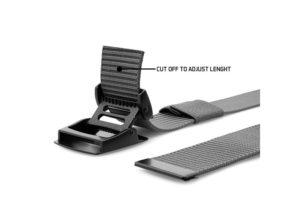 Skládá se z kovové přezky v matném černém provedení s bílým motivem. Přezka je vybavena jednoduchým mechanismem, pomocí kterého lze opasek zajistit na požadované délce. Samotný pásek je vyroben z hrubé a odolné tkaniny černé barvy a je dostatečně dlouhý, takže si jej můžete zkrátit podle své potřeby.