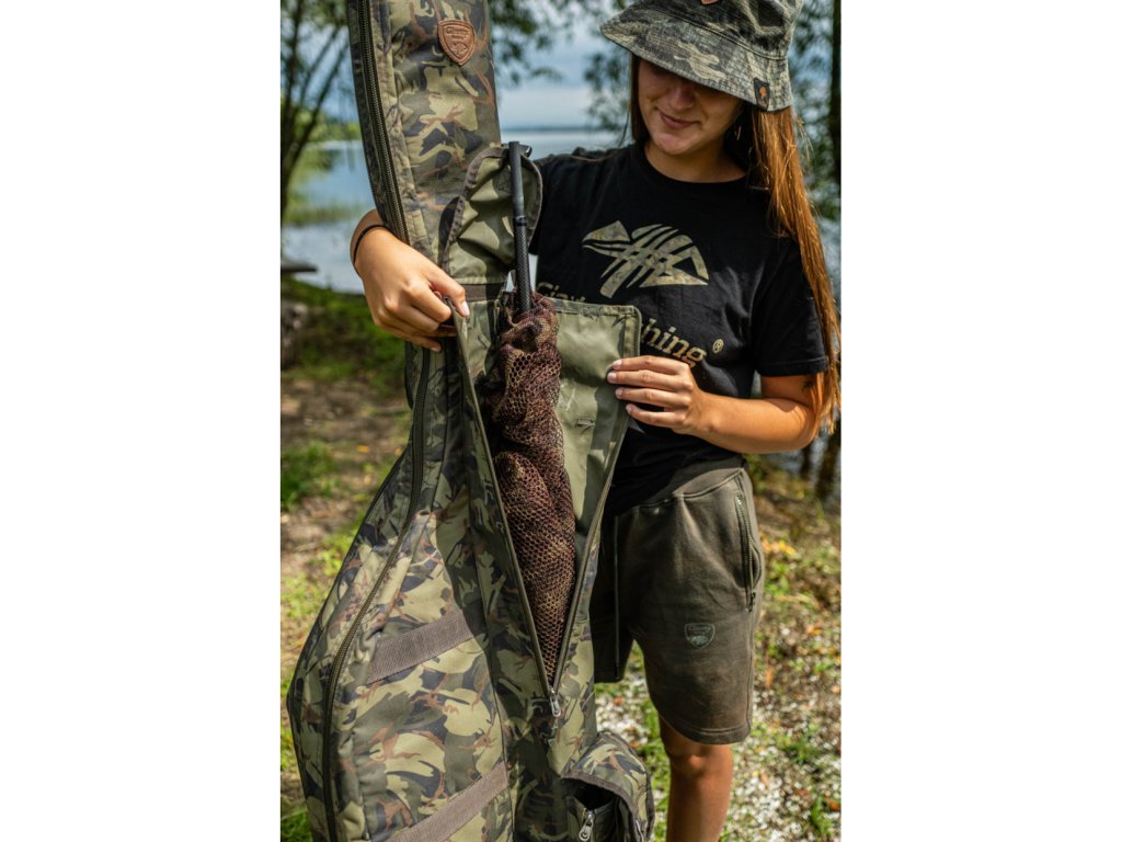 Samozřejmostí je polstrované provedení, které zajistí maximální ochranu Vašich prutů s navijáky. Hlavní popruh přes rameno je délkově nastavitelný a částečně polstrovaný. Z jedné strany jsou dvě kapsy, ta delší je určená na podběrák a ta kratší na vidličky. Z druhé strany naleznete částečnou kapsu se stahovacím popruhem pro uchycení deštníku.