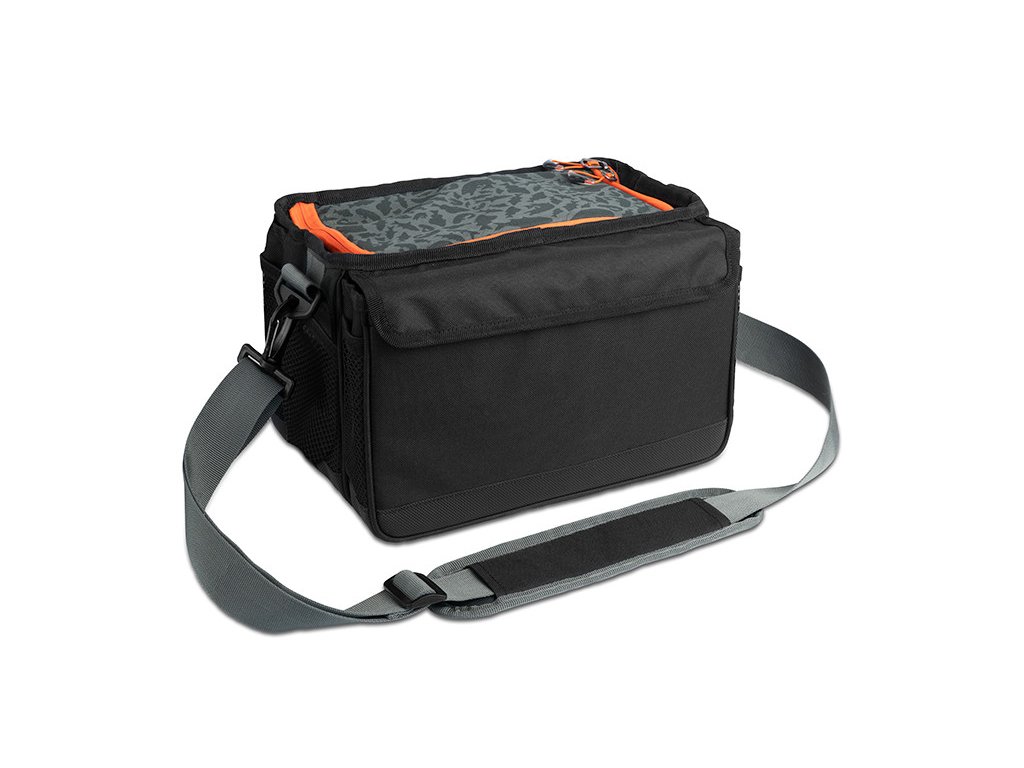 Kvalitní vnější zipy oranžové barvy jsou opatřeny plastovým taháčkem na oranžovém popruhu, který je na konci rozšířen, a proto jej lze rychle uchopit. Doplňky oranžové barvy umožňují rybáři, aby byla taška dobře viditelná i za šera a uměl ji okamžitě najít. Taška je ušita z lehké, ale přitom odolné látky černé barvy. Vybavena je černým popruhem určeným pro nošení přes rameno. Design tašky doplňuje naše jedinečná tmavá Darx ATAK! kamufláž se siluetami dravých ryb.