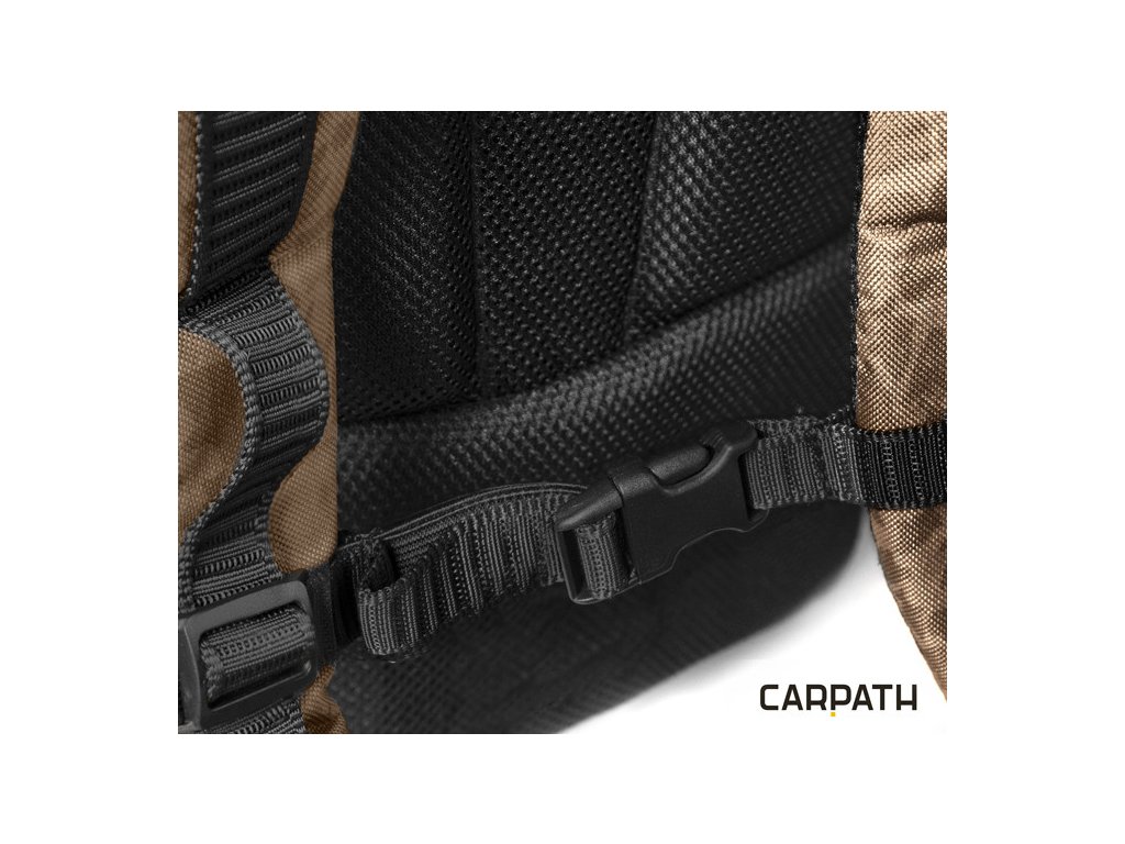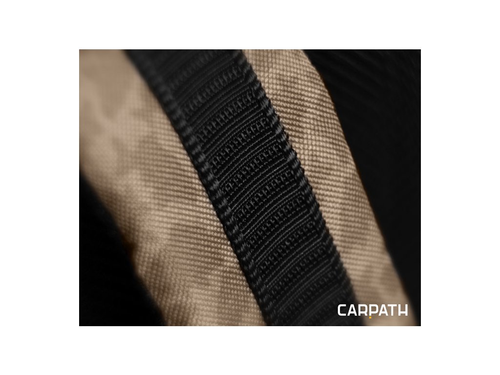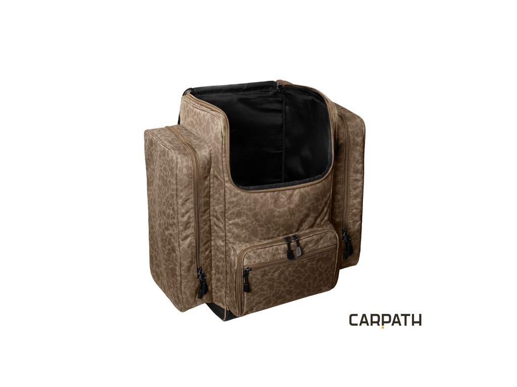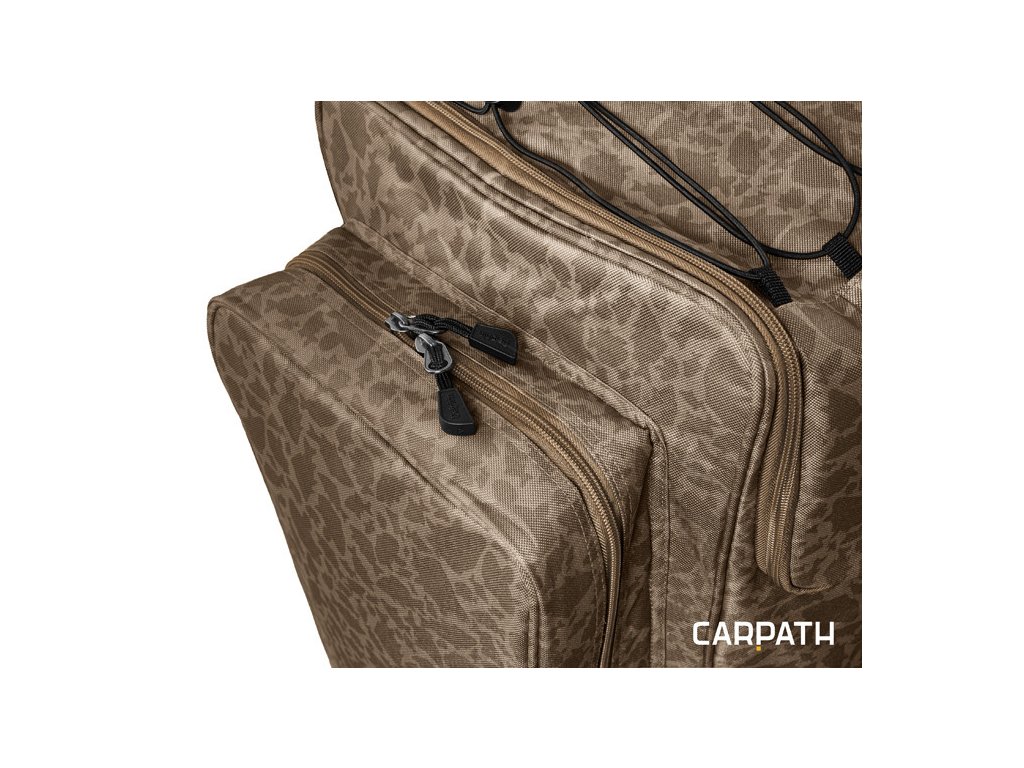 Batoh je vybaven kvalitními zipy. Vnější zipy jsou opatřeny plastovými taháčky. Design tašky doplňuje naše jedinečná hnědá CARPATH kamufláž se siluetami kaprů.