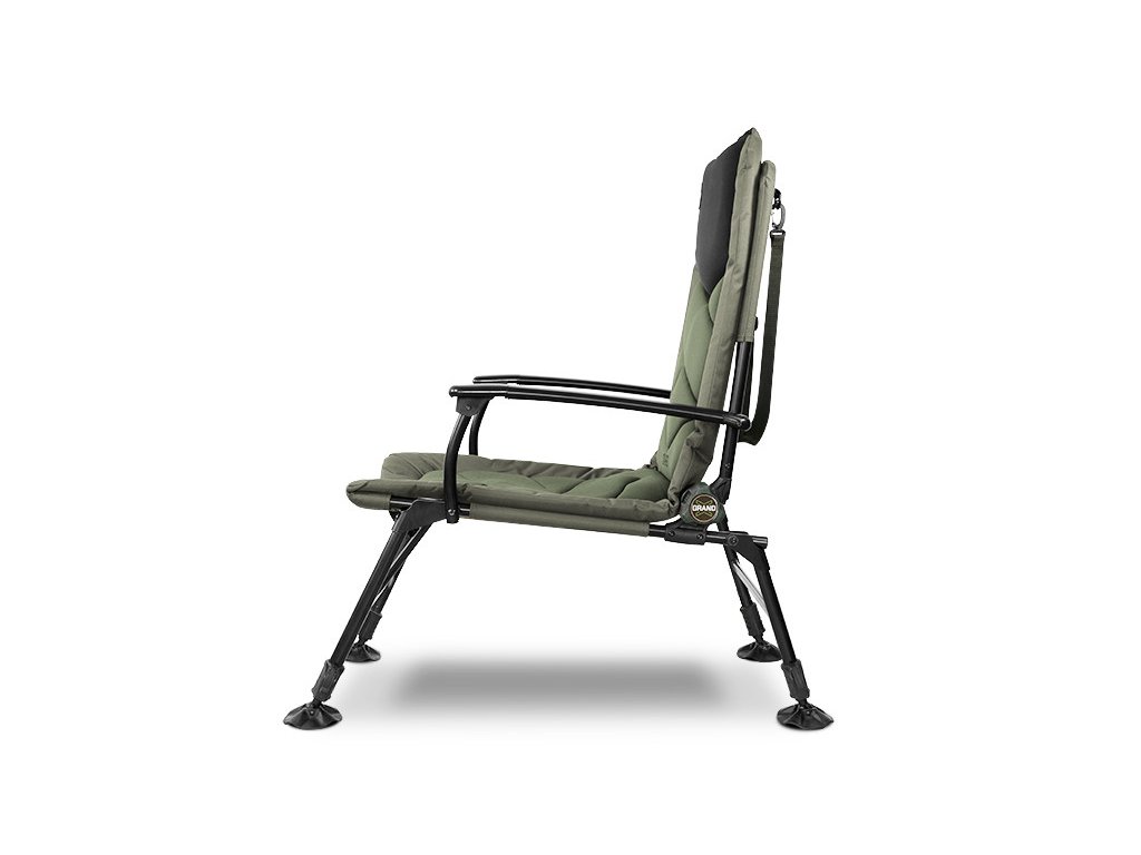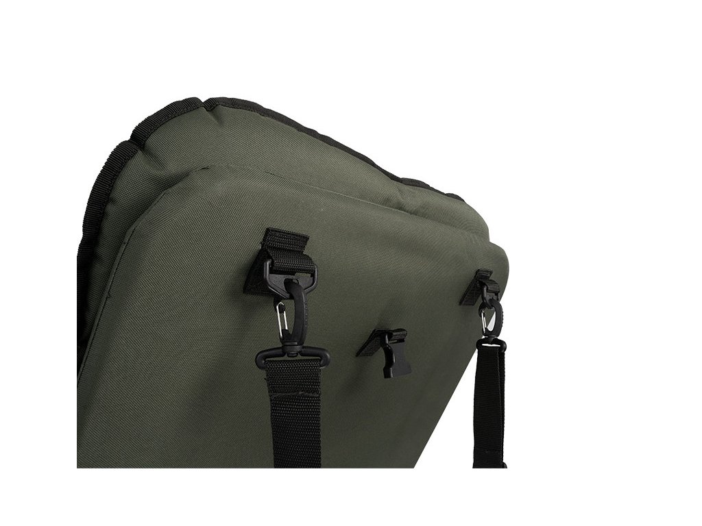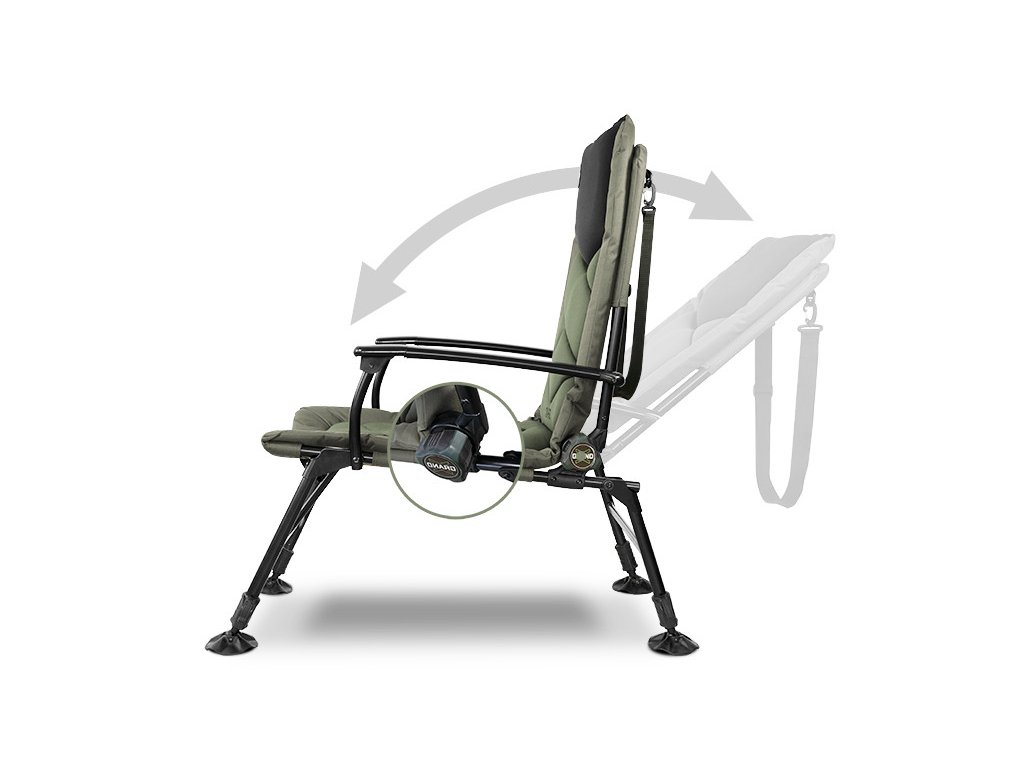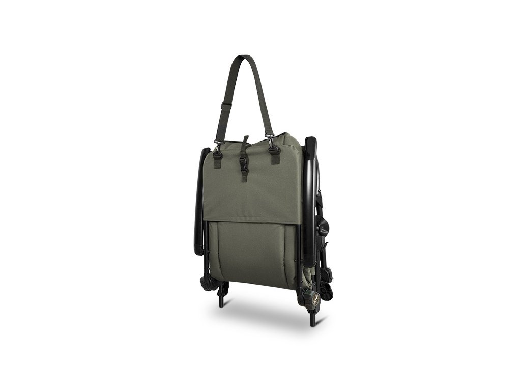 Robustní svařovaná ocelová konstrukce zajišťuje pevnost a šikmý rozestup nožiček zajišťuje vysokou stabilitu, což ocení zejména objemnější kapraři. I přes svoji pevnou konstrukci je křeslo poměrně lehké. Pro snadný transport jsme křeslo vybavili odepínatelným popruhem, který si lze přehodit přes rameno, a tím uvolňuje ruce pro přenos ostatního rybářského vybavení. Stejně tak je křeslo vybaveno plastovým klipem, který slouží k fixaci polohy křesla během přenosu a předchází nežádoucímu otevírání.