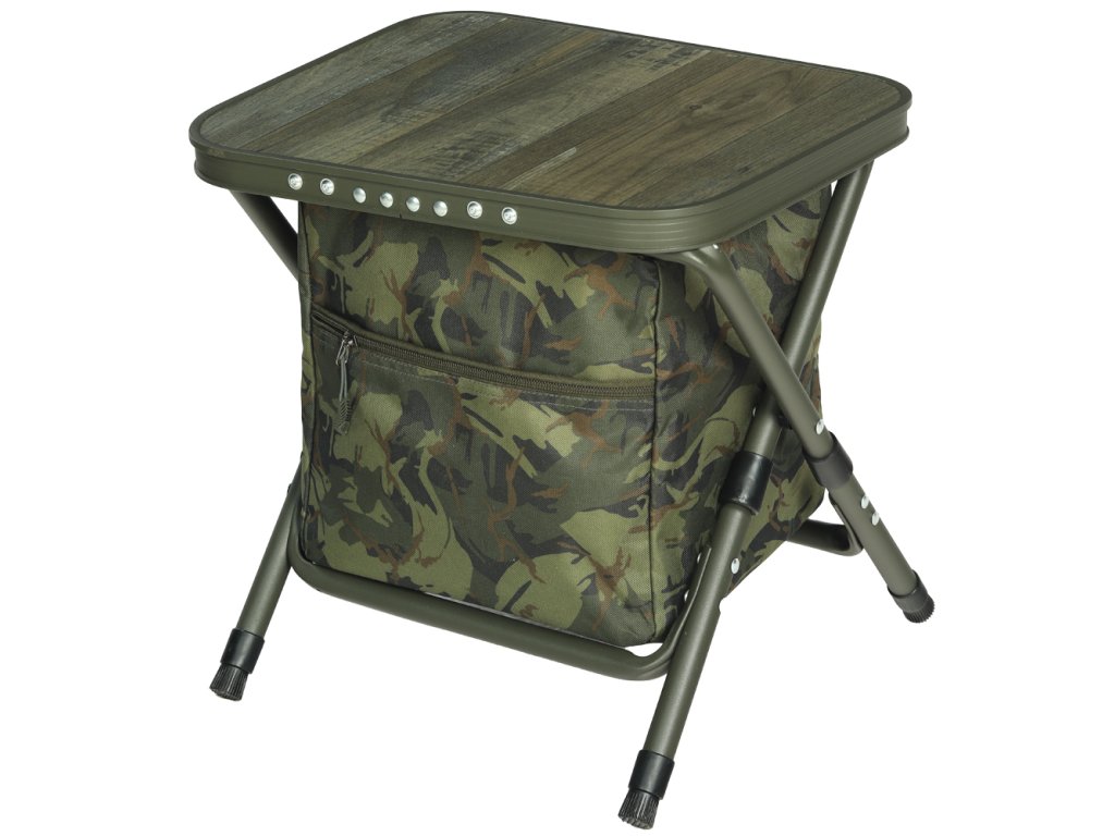 Vylepšená konstrukce, která zaručí snadnější sestavení a malé přepravní rozměry. Čtyři výškově nastavitelné nohy, které mají na svých koncích protiskluzové packy. Transportní obal je všit ve spodní části tašky a díky tomu ho máte vždy připravený k zabalení. Konstrukce je vyrobena z hliníkových trubek o průměru 19 a 20mm. Textilní část je vyrobená z nepromokavé polyesterové tkaniny, která je v decentním kamuflážovém vzoru.