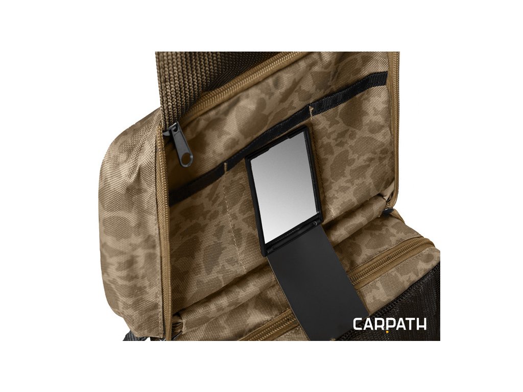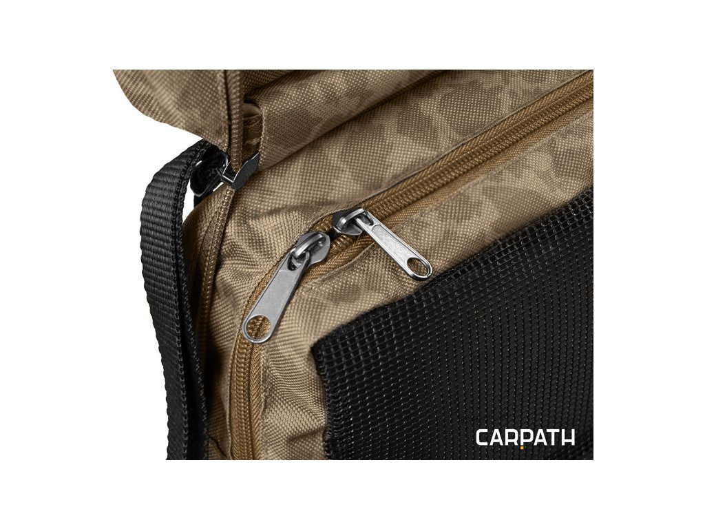 Taška je vybavena kvalitními zipy. Vnější zipy jsou vybaveny plastovými taháčky, které jsou na konci rozšířeny, a proto je možné je jednoduše uchopit a tašku rychle otevřít. Design tašky doplňuje naše jedinečná hnědá Carpath kamufláž se siluetami kaprů.