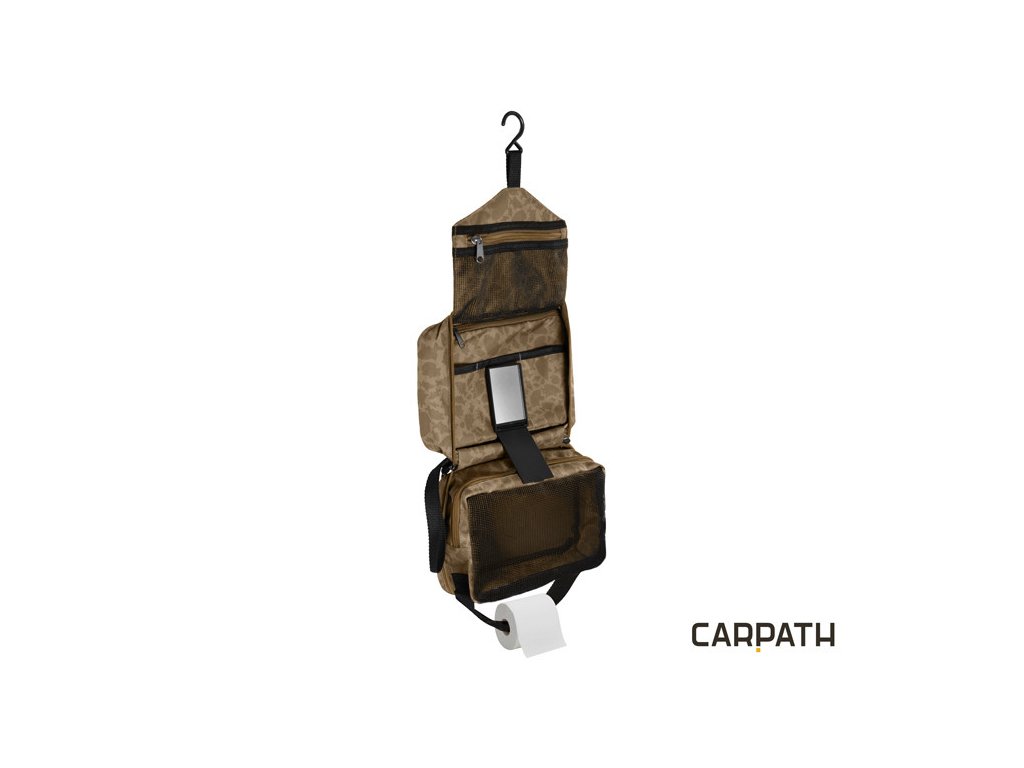 Taška je vybavena praktickým popruhem na suchý zip, který je doplněn o plastový háček. To umožňuje zavěšení tašky v bivaku, nebo na kmen či větev stromu a podobně. Na opačném konci jsme umístili popruh na suchý zip, který provlečete středem role toaletního papíru a spojíte. Následně můžete tento toaletní papír bez problémů odvíjet. Uvnitř se nachází kapsa na toaletní papír a další praktické odkládací prostory, které jsou uzavíratelné zipem. Ve střední části se nacházejí 3 přepážky, do kterých si můžete uložit například hřeben, pinzetu, nůžky a jiné. Najdeme zde také malé zrcadlo (5.5x8cm), které je vybaveno plastovou krytkou a připevněné k taštičce prostřednictvím suchého zipu, a v případě potřeby ho můžete i vyjmout. Na venkovní straně je taška opatřena poutkem pro snazší nošení.