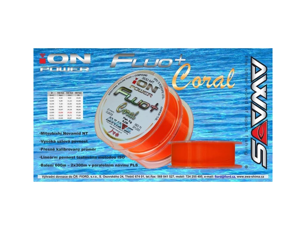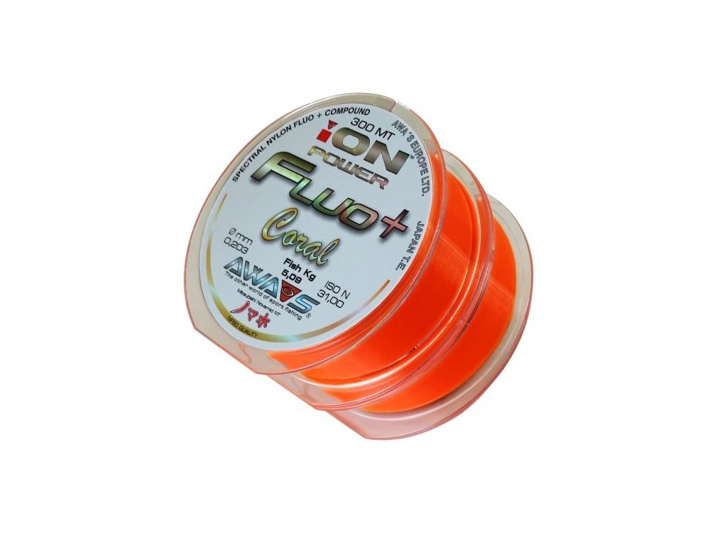 Díky tomu se podařilo vyvinout monofil s vysokou lineární i uzlovou pevností a stálou barevností.Vlasce FLUO+ jsou určené k širokému použití,atˇuž při lovu kaprů,na přívlač nebo při mořském rybolovu.Jejich barva díky dobré viditelnosti při různých světelných podmínkách napomáhá jak při nahazování a kontrole pozice nástrahy,tak i při zdolávání úlovku a přitom pod vodní hladinou zůstává pro rybu téměř neviditelná.Balené jsou na dvou spojených cívkách,na každé po 300 m v paralelním hladkém návinu (PLS-Paralell Line Spooling),takže spodní vrstvy zůstávají perfektně hladké a nestlačené od vrchních vrstev,což napomáhá k jejich delší životnosti a k dosahování delších hodů.Nová série FLUO+ rozšiřuje řadu vlasců AWA´S ION POWER o špičkové monofily s mimořádnými vlastnostmi a vynikajícími fyzikálními parametry.Série FLUO+ zahrnuje tři barevné varianty -žlutou fluo s označením SUN,oranžovou fluo s označením CORAL a černou BLACK.Tyto monofily jsou vyrobené s použitím nejkvalitnějších MITSUBISHI NOVAMID NT polymerů,které jsou díky jedinečnému výrobnímu procesu barvené na molekulární úrovni,což znamená,že barva je už přímo navázaná na základní surovinu-polymér,ještě před jeho použitím při výrobě samotného monofilu.Díky tomu se podařilo vyvinout monofil s vysokou lineární i uzlovou pevností a stálou barevností.Vlasce FLUO+ jsou určené k širokému použití,atˇuž při lovu kaprů,na přívlač nebo při mořském rybolovu.Jejich barva díky dobré viditelnosti při různých světelných podmínkách napomáhá jak při nahazování a kontrole pozice nástrahy,tak i při zdolávání úlovku a přitom pod vodní hladinou zůstává pro rybu téměř neviditelná.Balené jsou na dvou spojených cívkách,na každé po 300 m v paralelním hladkém návinu (PLS-Paralell Line Spooling),takže spodní vrstvy zůstávají perfektně hladké a nestlačené od vrchních vrstev,což napomáhá k jejich delší životnosti a k dosahování delších hodů.