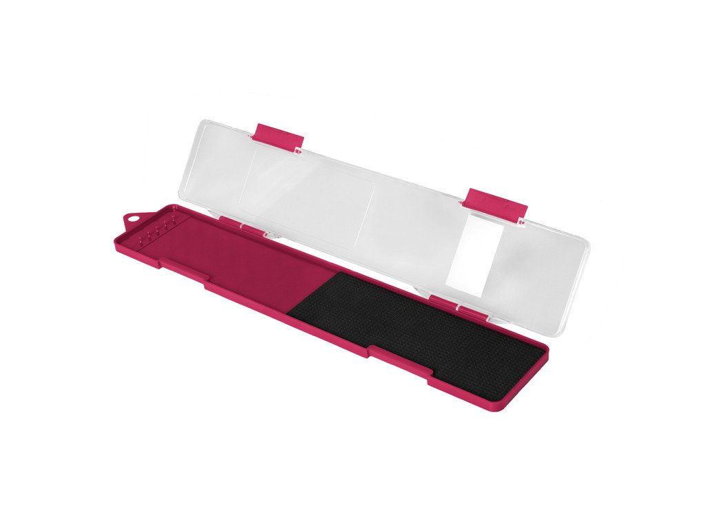 Tento plochý box je vyroben z plastu. Jeho spodní část je vínové barvy, doplněná o plastové výběžky, na které upevníte návazce a o EVA pěnu, kde můžete zapíchnout háčky. Vrchní část je z průhledného plastu, abyste měli dokonalý přehled o umístění návazců. Uzavírá se dvěma klipy.