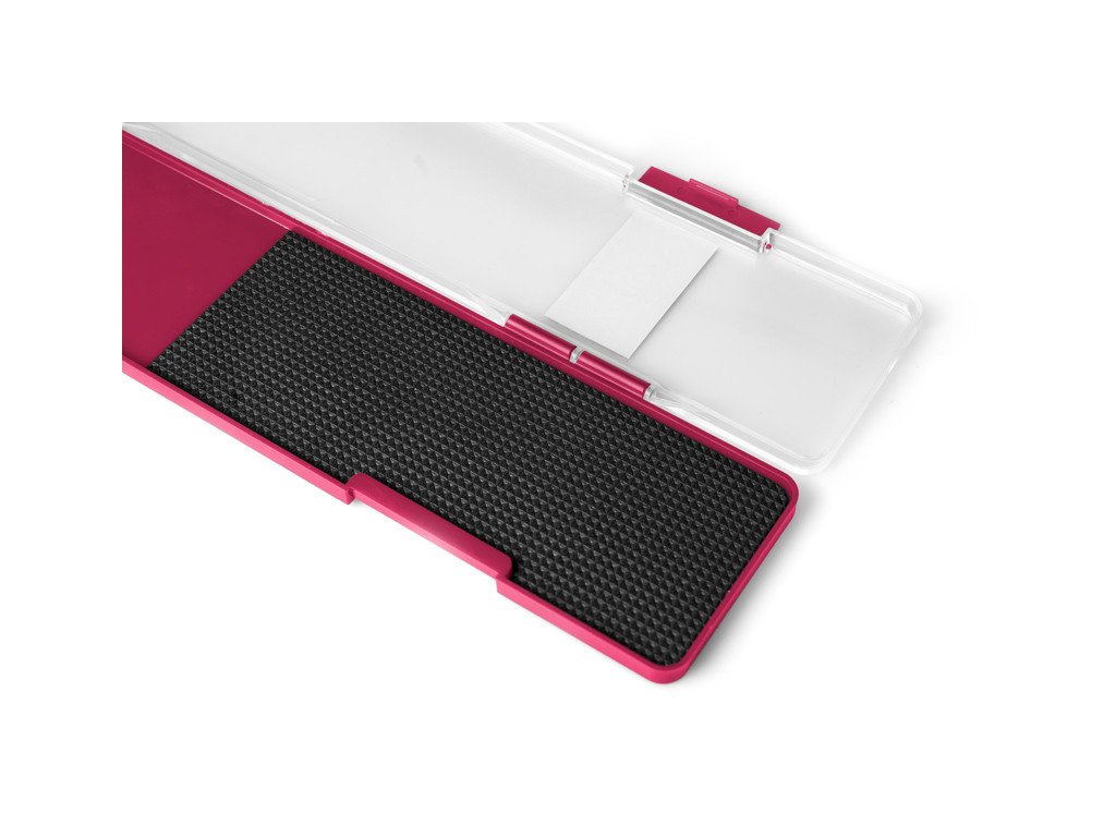 Tento plochý box je vyroben z plastu. Jeho spodní část je vínové barvy, doplněná o plastové výběžky, na které upevníte návazce a o EVA pěnu, kde můžete zapíchnout háčky. Vrchní část je z průhledného plastu, abyste měli dokonalý přehled o umístění návazců. Uzavírá se dvěma klipy.